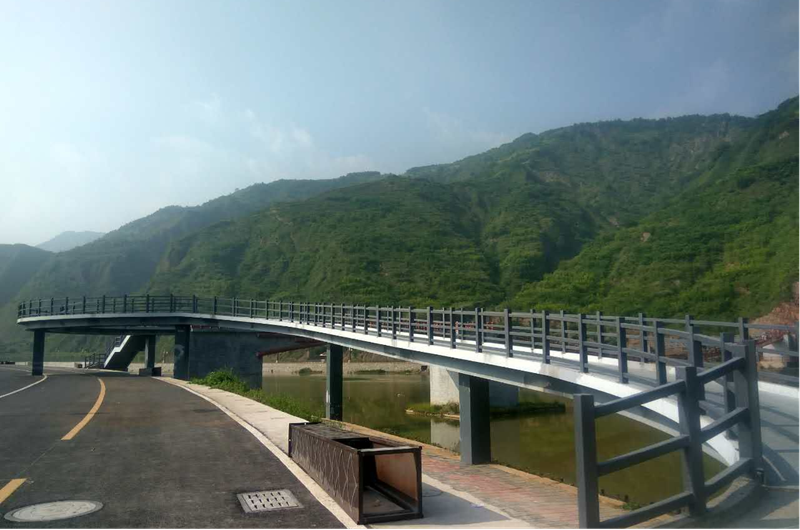 商洛市丹凤县棣花镇钢索桥北岸南岸人行桥建设工程,北岸接线桥和南岸接线桥。北岸接线桥含一条向西方向平面S型跨越既有桥头下方道路的坡道桥及一条向东方向落地的梯道桥。南岸桥梁为既有吊桥朝南桥头的向东方向落地坡道桥。两座桥均为曲线桥梁,北岸桥坡道桥长84.83m,宽3m,最大坡率1:12.梯道桥长15.358m,宽2.5m,坡率1:2;南岸桥梁长98.646m,宽3m,坡率为1:12。桥梁总面积:北岸桥292.9平方米,南岸桥295.94平方米。