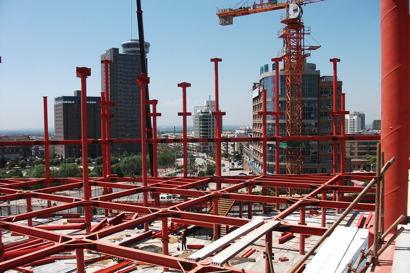 临潼商城钢工程,总建筑面积约24547平方米,地上面积20383.3平方米.主体为五层钢框架结构。总高度为31.5米。框架钢柱为焊接园型柱,钢梁为焊接H型钢梁,楼面为压型钢板与混凝土叠合楼板。