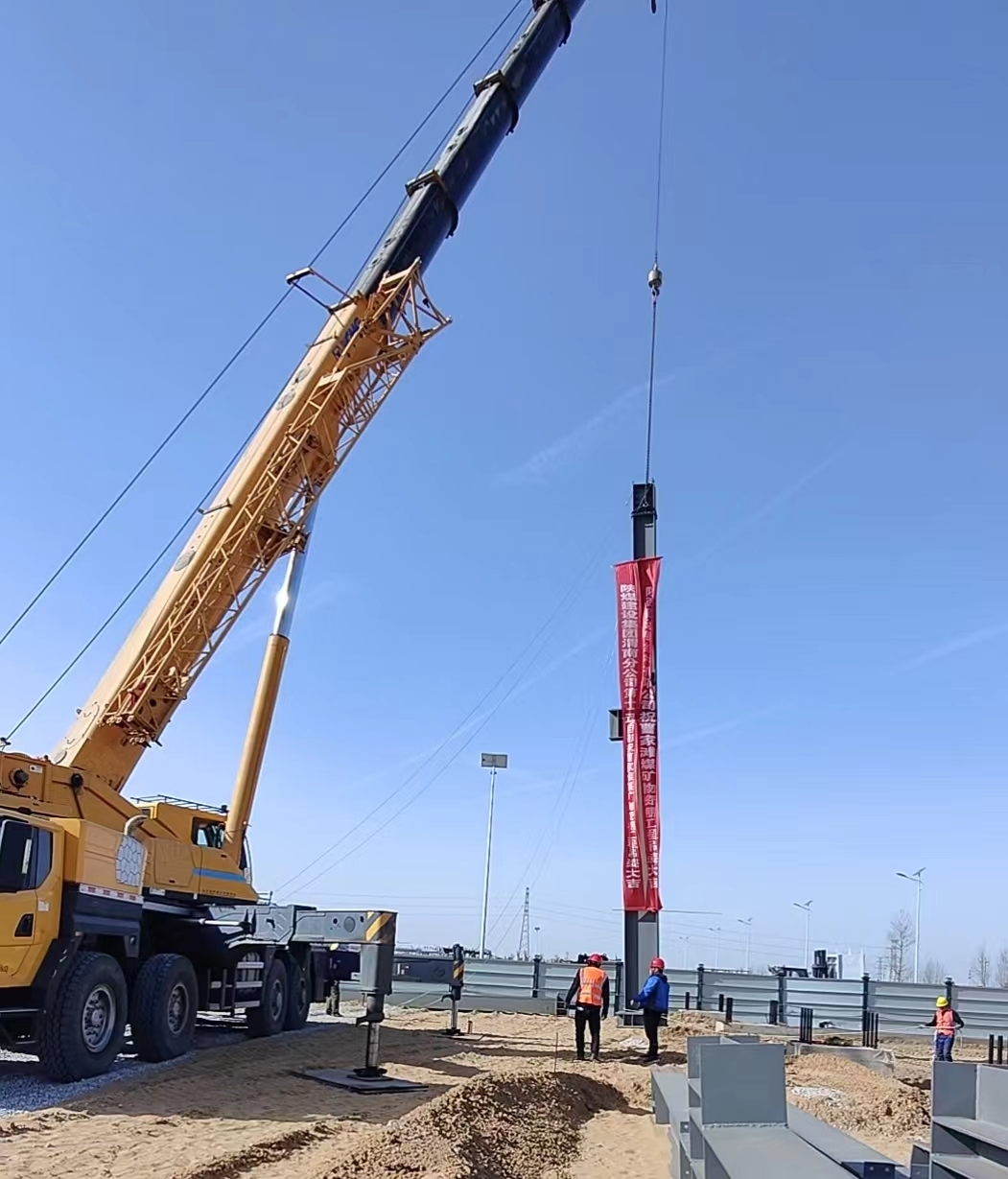 建设钢构顺利完成曹家滩煤矿新建物资棚项目钢结构工程首根钢柱吊装任务